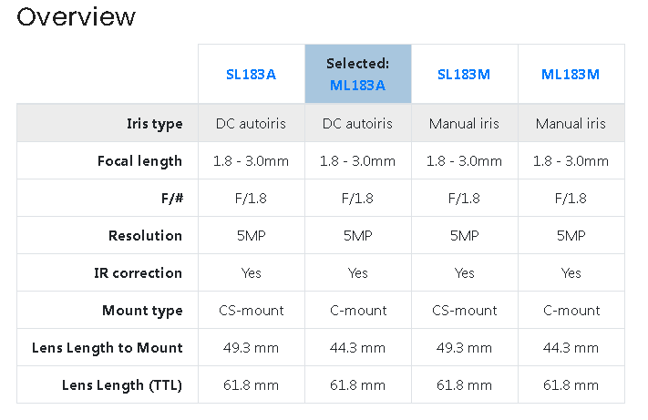 SL183A/ML183A/SL183M/ML183M 超广角 无失真变焦镜头 超广角无畸变